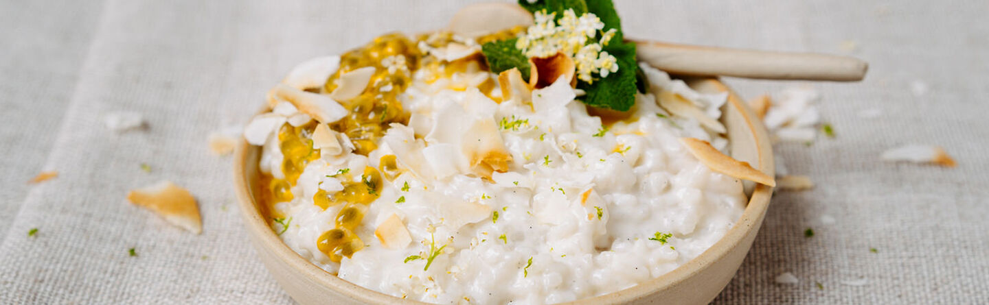 I would love to introduce restaurant Rouhi’s signature dessert: coconut rice pudding. This is a classic dish that I revisited and reinvented. We like to serve it with whatever fruits the season has in store for us (or whatever you have left over in your fridge). For this recipe, we will pair it with passionfruit. Enjoy!
